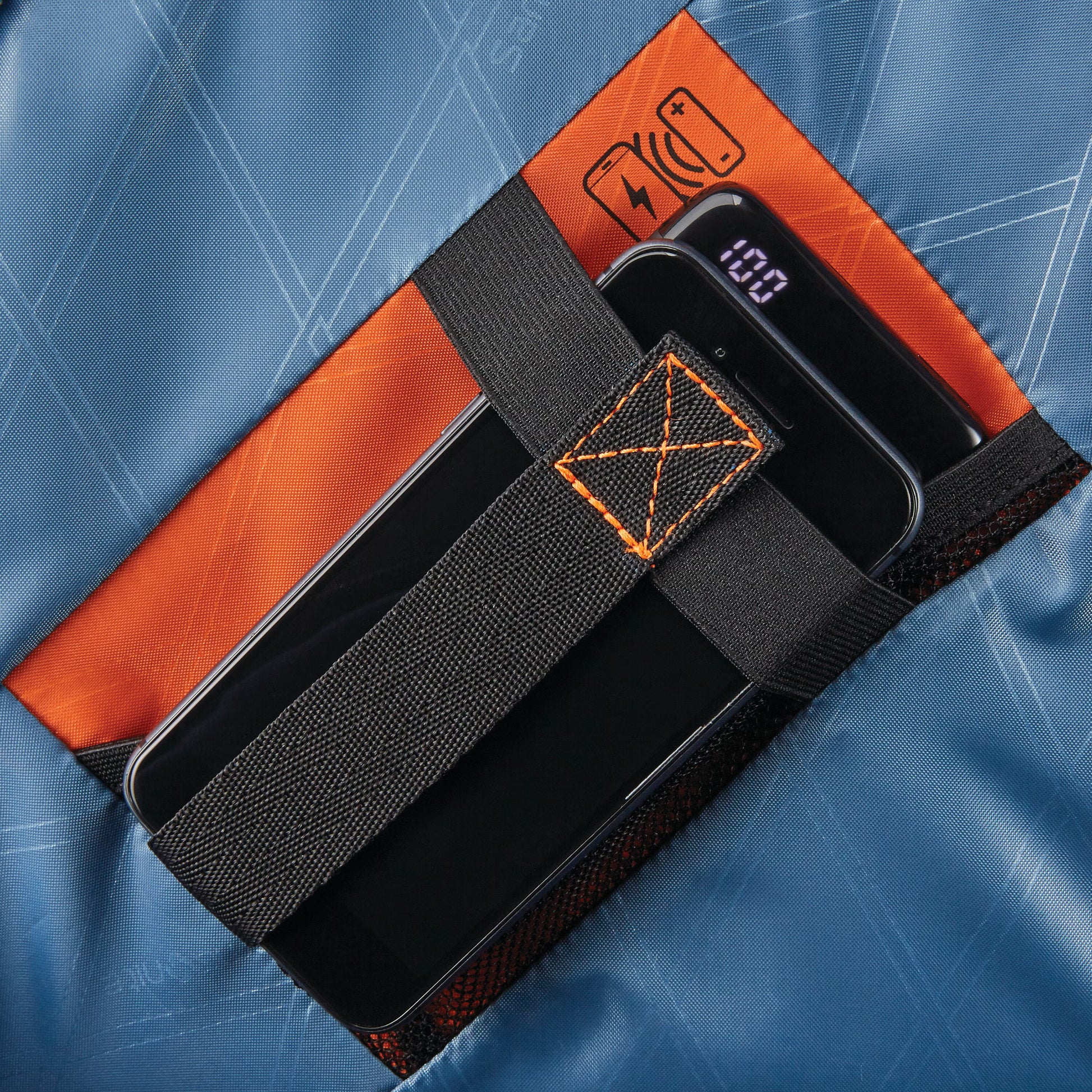 - Removable pouch holds personal electronics and accessories.